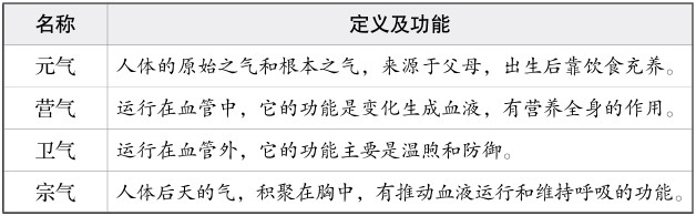 2. 掌握中医专业词语:元气、营气、卫气、宗气。