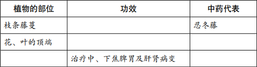 2. 很多植物的枝条藤蔓都具有 的功效,常用来治疗四肢、关节部位的疾病,如忍冬藤、 、海风藤等。