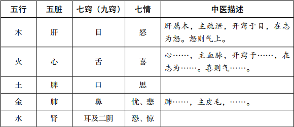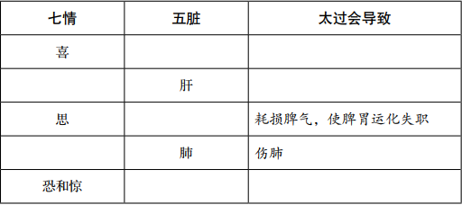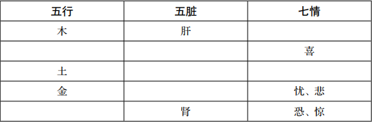 请根据五行、五脏、七情的对应关系填写下列表格。